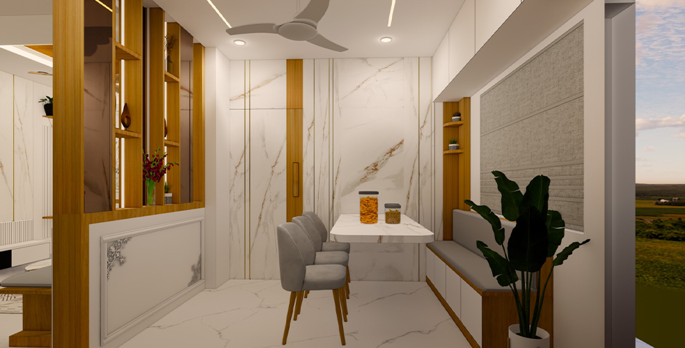 Our services include wall décor, dining furniture selection, lighting solutions, flooring, false ceiling designs, and space planning. Whether you prefer a contemporary open-concept dining area or a traditional, cozy space, we bring your vision to life with high-quality materials and expert craftsmanship.